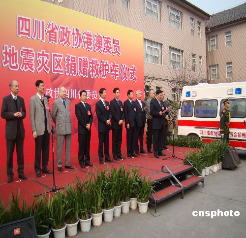 1月14日,參加政協(xié)四川省十屆二次會議的港澳委員向地震災區(qū)捐贈了一批救護車,用以改善地震災區(qū)受贈醫(yī)療機構(gòu)醫(yī)療衛(wèi)生設備缺乏現(xiàn)狀。圖為救護車捐贈儀式現(xiàn)場。中新社發(fā) 王萌 攝