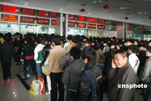 2009年1月15日,福建福州汽車(chē)北站的售票大廳排起了長(zhǎng)長(zhǎng)的購(gòu)票隊(duì)伍。隨著春節(jié)鄰近,福州迎來(lái)了省內(nèi)旅客的購(gòu)票高峰。中新社發(fā) 張 斌 攝