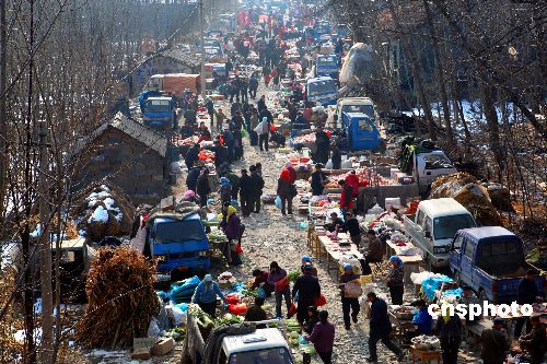 進入農歷臘月,中國山東一些農村集市逐步紅火,特別是春節(jié)臨近,山村集市上車水馬龍,一派“清明上河圖”景象。中新社發(fā) 宋吉河 攝