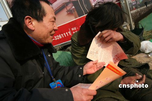 1月22日,許昌市救助管理站的工作人員在救助一個(gè)生活無著人員。春節(jié)即將到來,為更好地向困難群體獻(xiàn)愛心、送溫暖,不讓一個(gè)生活無著人員流落街頭,當(dāng)日,河南省許昌市救助管理站開展“迎新春社會(huì)關(guān)愛生活無著人員”活動(dòng),對(duì)符合救助條件的求助者,無償提供食宿、幫助聯(lián)系親屬等。這次活動(dòng)除與各區(qū)縣救助站同時(shí)開展宣傳、咨詢活動(dòng)外,還會(huì)派流動(dòng)小分隊(duì)走上街頭,對(duì)生活無著人員進(jìn)行勸導(dǎo),實(shí)施現(xiàn)場救助。中新社發(fā) 牛書培 攝