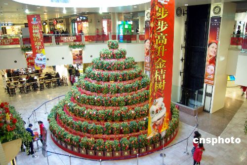 2009年1月25日,北京東方新天地為迎接新春佳節(jié)特制一個(gè)高達(dá)6米的巨大金桔樹塔,上面掛滿了寫著各式祝福的紅包。中新社發(fā) 九州 攝