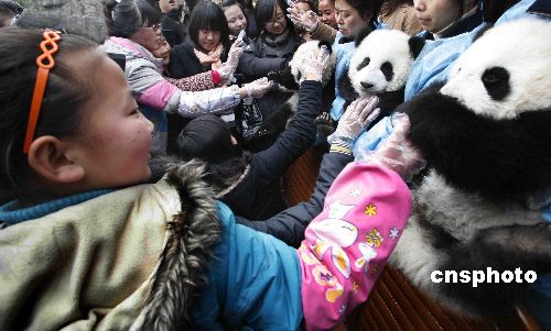 1月17日,中國農(nóng)歷大年初二,來自都江堰的十七名因汶川大地震新增的“三孤”人員,受邀來到成都大熊貓繁育研究基地:參觀大熊貓產(chǎn)房、品嘗大熊貓專用“窩頭”、和大熊貓親密接觸合影留念……度過了一個(gè)獨(dú)具意義的春節(jié)。圖為孩子們與大熊貓親密接觸。中新社發(fā) 張全能 攝