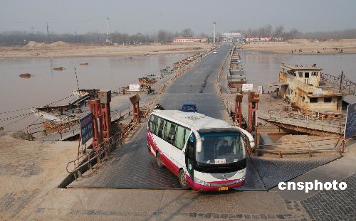 2009年1月29日,車(chē)輛從剛恢復(fù)通車(chē)的濼口浮橋上通過(guò)。由于近期氣溫回升,黃河濟(jì)南段流凌密度降至10%以下,截至上午8時(shí),濼口段流量保持在248立方米/秒以下,持續(xù)一個(gè)多月的凌汛已經(jīng)大幅度緩解。據(jù)濟(jì)南黃河防汛辦公室專(zhuān)家稱(chēng),近期黃河下游不會(huì)形成嚴(yán)重凌汛。濼口浮橋下游的章丘、歷程、濟(jì)陽(yáng)有10段封河,封河長(zhǎng)度在25公里左右。中新社發(fā) 滕越 攝