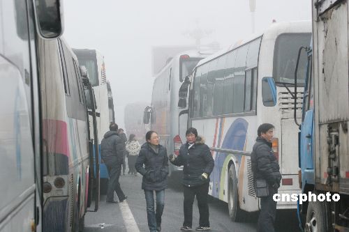 2009年2月1日上午,在同三高速公路江蘇省贛榆縣出口處,車輛等待霧散通行。連日來,江蘇省大部分地區(qū)遭遇持續(xù)大霧天氣,部分地區(qū)能見度不足50米,給旅客出行及運輸帶來影響。當(dāng)?shù)貧庀蟛块T發(fā)布大霧黃色預(yù)警,交通安全部門提醒旅客要注意出行安全。中新社發(fā) 司偉 攝