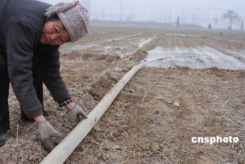2009年2月4日,山西小麥產(chǎn)地運(yùn)城新絳縣農(nóng)民在全力以赴進(jìn)行抗旱工作。入冬后,山西省受旱面積達(dá)3274萬畝,其中山西小麥主產(chǎn)區(qū)運(yùn)城、臨汾兩地農(nóng)作物受旱面積達(dá)634萬畝,同時(shí)有106萬群眾及19萬頭牲畜出現(xiàn)飲水難問題。2月3日,山西省政府防汛抗旱指揮部已發(fā)布干旱橙色預(yù)警(Ⅱ級)并啟動響應(yīng)行動。山西省財(cái)政緊急下?lián)芸购蒂Y金1000萬元。中新社發(fā) 高新生 攝
