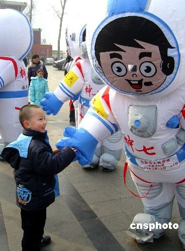 2月4日,《飛天壯歌——中國首次太空漫步航天展》新聞發(fā)布會現(xiàn)場,河北兒童與扮成“航天員”的工作人員握手。《飛天壯歌——中國首次太空漫步航天展》全國巡展即將于2月13日在河北省石家莊市啟動。主辦方稱,這是中國航天史上規(guī)模最大、規(guī)格最高的航天尖端科技成就展,將有大量神七航天實(shí)物現(xiàn)場展出,包括神七宇宙飛船返回艙、價值三千萬元人民幣的宇航員艙外航天服、火箭整流罩殘骸,以及翟志剛遨游太空出艙時揮舞的國旗等重要實(shí)物。中新社發(fā) 牛琳 攝