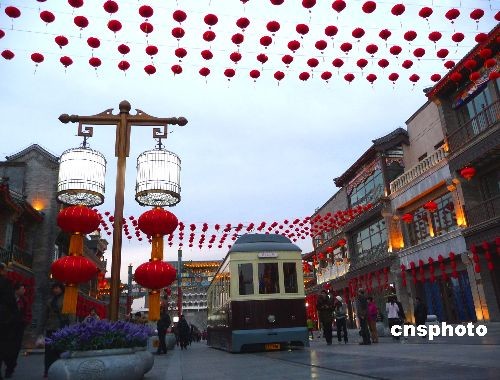 2009年2月7日(農(nóng)歷正月十三),大紅燈籠懸掛北京前門大街,迎接元宵佳節(jié)到來(lái)。據(jù)悉,2月9日(農(nóng)歷正月十五),前門大街將舉行元宵節(jié)踩街活動(dòng),來(lái)自北京、河北、山東的花會(huì)隊(duì),將從正陽(yáng)門箭樓南側(cè)和前門五牌樓之間被彩綢包圍的“儀式場(chǎng)”出發(fā)。16只南獅和北獅將為大隊(duì)人馬開(kāi)道,隨后,中幡、旱船、二魁摔跤、地秧歌、鼓子秧歌等將依次向珠市口行進(jìn)。中新社發(fā) 玉龍 攝