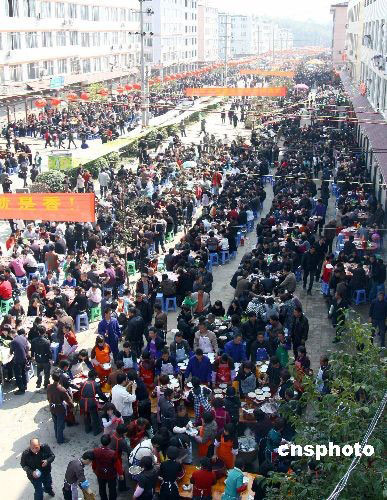 圖為位于雅陽(yáng)的兩千多桌宴席。2月9日,中國(guó)傳統(tǒng)的元宵節(jié),在浙江省泰順縣,在這一天就會(huì)邀請(qǐng)四方的賓客相聚在洲嶺、雅陽(yáng)、西旸等地。今年雅陽(yáng)的“百家宴”歷史以來(lái)規(guī)模也是最大的一次,達(dá)到一千多桌,一萬(wàn)多人,且和文化旅游相組合,推出了許多的節(jié)目,F(xiàn)在,“百家宴”已經(jīng)成為一種帶有民間聯(lián)誼性質(zhì)的活動(dòng),人們歡聚一堂聯(lián)絡(luò)感情,互送祝福,譜寫盛世和諧新篇章。中新社發(fā) 鎬璽 攝