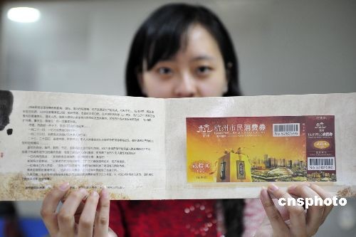 2月23日,10萬冊(cè)《杭州市市民消費(fèi)券珍藏冊(cè)》在杭州公開發(fā)行。1月20日起,杭州市向全市六城區(qū)67萬特殊人群發(fā)放了1億元消費(fèi)券,在過去的一個(gè)月內(nèi),已經(jīng)十分有效地達(dá)到了“保障民生,拉動(dòng)消費(fèi)”的目標(biāo)。在此前提下,為滿足廣大市民珍藏消費(fèi)券,保存這份特殊記憶的要求,市財(cái)政部門特別制作并發(fā)行10萬冊(cè)《杭州市市民消費(fèi)券珍藏冊(cè)》,每?jī)?cè)收藏五張“杭州市民消費(fèi)券”,每張面值20元,價(jià)值100元,整冊(cè)發(fā)行價(jià)亦為100元人民幣。冊(cè)內(nèi)消費(fèi)券不僅具有收藏價(jià)值,也可以憑券消費(fèi),同時(shí)享受商家提供的優(yōu)惠服務(wù)。中新社發(fā) 李忠1 攝