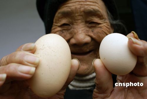 2月24日,山東省棗莊市山亭區(qū)北莊鎮(zhèn)后峪村76歲老人秦傳蘭家的一只母雞產(chǎn)下一枚重127克的巨型蛋,該雞蛋長約8厘米,重127克,有3個(gè)普通雞蛋大。中新社發(fā) 王森王 攝