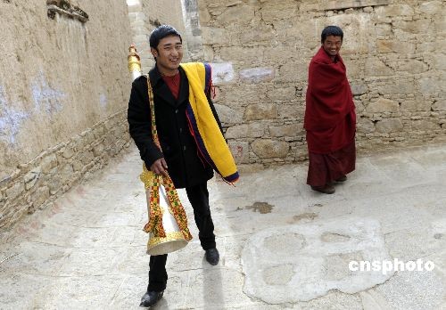 2月24日,藏歷年三十,拉薩哲蚌寺內(nèi)穿著時髦的拉薩哲蚌寺喇嘛群培格桑剛剛跟老師學(xué)習(xí)完吹法號的技法,在藏歷新年的佛事活動中,他將上陣吹響法號。為僧已經(jīng)十多年的群培格桑喜歡偶爾穿著美觀的便裝。中新社發(fā) 廖攀 攝