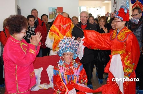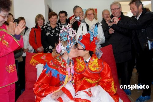 3月1日,江蘇鎮(zhèn)江市永安新城小區(qū)的喬樑迎娶比利時姑娘多娜。據(jù)了解,喬樑是在留學比利時期間與校友多娜相識、相戀、相愛走到了一起,兩人商議在中國舉行婚禮的想法得到雙方父母支持,多娜的20多位親友也從比利時隨行來中國參加了婚禮活動。中新社發(fā) 陳崗 攝