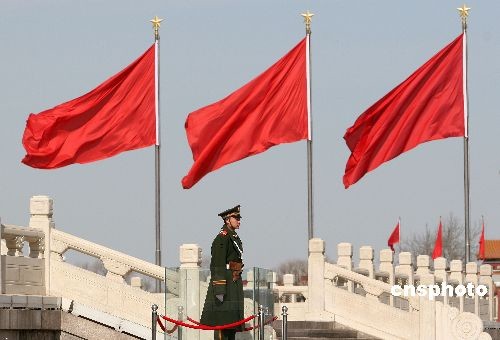2009年3月1日,“兩會(huì)”即將召開(kāi),北京天安門廣場(chǎng)及周邊建筑掛起了紅旗,廣場(chǎng)上一片喜慶祥和氣氛。中新社發(fā) 魯谷 攝