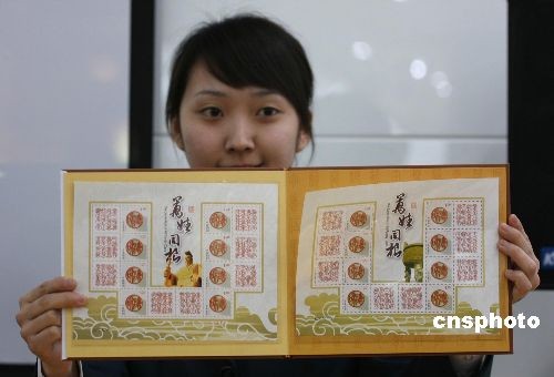 三月十二日上午,鄭州市郵政局舉行的己丑年黃帝故里拜祖大典系列郵票首發(fā)儀式上,工作人員展示鑲嵌有黃帝像的“和諧”郵品。據(jù)悉,國(guó)家郵政局為己丑年黃帝故里拜祖大典特別批準(zhǔn)發(fā)行了《華夏盛典 萬(wàn)姓同根》百家姓個(gè)性化郵票,該郵票一套共四版三十二枚。采用的“和諧”主圖,系國(guó)家郵政局為慶祝祖國(guó)六十華誕特發(fā)行的新版主圖。中新社發(fā) 王中舉 攝