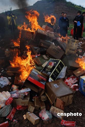 3月13日,重慶市璧山縣工商、質(zhì)監(jiān)、煙草等相關(guān)部門將收繳的假冒偽劣商品集中銷毀。據(jù)悉,此次被銷毀的偽劣商品有化妝品、日用品、假煙、假酒等539個(gè)品種。中新社發(fā) 謝捷 攝