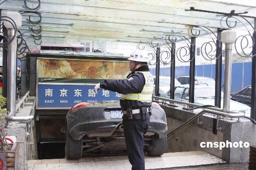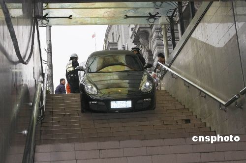 三月十三日下午一點(diǎn)左右,一輛保時(shí)捷豪華跑車,誤打誤撞駛?cè)肷虾!巴鉃┦颂?hào)”著名老建筑門前的“南京東路人行地道”內(nèi),女司機(jī)在發(fā)現(xiàn)是人行通道后趕緊剎車。在搶險(xiǎn)過程中,一名上前幫忙牽引的工人被擠壓成重傷。中新社發(fā) 宣克炅 攝