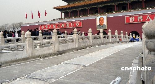 2009年3月15日,北京天安門金水橋修繕工程正在加緊進行,已經(jīng)鋪設好的青磚橋面呈現(xiàn)出修舊如舊的古韻風姿。 據(jù)悉,天安門金水橋鋪設青磚工作完成后,將在橋上架設棧道,棧道將滿鋪木板,能夠承受游人活動等所產(chǎn)生的荷載強度等。為便于今后金水橋橋面的排水和通風,新修的棧道將架空于橋面。棧道與橋面支撐處采取彈性相接,并選擇橋面范圍以外的地方進行固定。