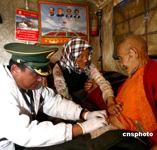3月18日,武警西藏總隊醫(yī)院派出專家巡診團,來到拉薩市當雄縣格達鄉(xiāng)羊易村10.6地震災(zāi)區(qū),對因在地震中受傷的10余名傷員進行跟蹤治療,并為其他災(zāi)民進行了春季防病知識宣講及診斷治療。 中新社發(fā) 張權(quán) 攝