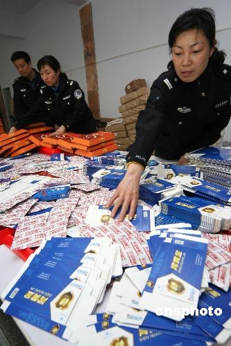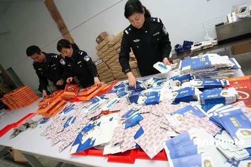 3月18日,河南許昌市魏都公安分局民警在涉嫌制造假藥窩點(diǎn)統(tǒng)計(jì)查獲的假藥及藥品標(biāo)簽、藥盒等。當(dāng)日,魏都警方接群眾舉報(bào),在一閑置廠房?jī)?nèi)查獲涉嫌制造假藥窩點(diǎn),當(dāng)場(chǎng)查扣涉嫌假冒藥品10多種,半成品藥品、包裝箱、合格證、防偽標(biāo)識(shí)等1000多件,涉案值達(dá)2000余萬(wàn)元。假冒藥品有五豆平糖膠囊、腎金子、腎黃金、協(xié)和降脂等10多種,藥效包含降壓、減肥、壯陽(yáng)滋補(bǔ)等。藥品的制假技術(shù)很高,須借助儀器檢測(cè)才能區(qū)別。此案正在進(jìn)一步調(diào)查處理中。中新社發(fā) 牛書(shū)培 攝