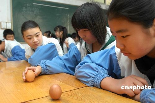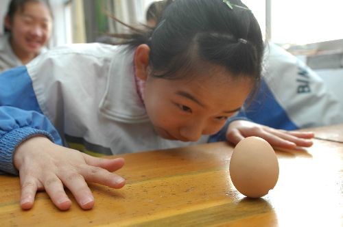 3月20日,山東鄒平縣實(shí)驗(yàn)中學(xué)的學(xué)生在立雞蛋。當(dāng)日是春分,我國民間有在這天立雞蛋的傳統(tǒng),在春分立蛋的說法中,認(rèn)為春分這一天,太陽直射在赤道上,地球的引力會(huì)發(fā)生變化,雞蛋所受到的重力會(huì)隨著引力的變化而變化,因此雞蛋會(huì)更容易站立起來。中新社發(fā) 董乃德 攝