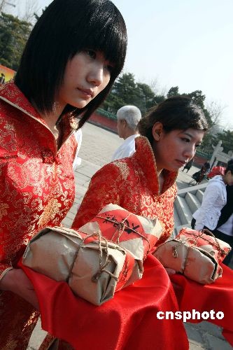 三月二十日,是中國二十四節(jié)氣中的春分。北京春分朝陽民俗文化藝術(shù)節(jié)閃亮登場,為中國這一第一批非物質(zhì)文化遺產(chǎn)的傳承提供了展示的天地。北京春分朝陽民俗文化藝術(shù)節(jié)于二零零七年開始首創(chuàng),直至今年已經(jīng)舉辦了三屆,由于內(nèi)容豐富多彩,為百姓喜聞樂見而深受歡迎。圖為現(xiàn)場將春分節(jié)令食品--太陽糕贈(zèng)送給志愿者。中新社發(fā) 任海霞 攝