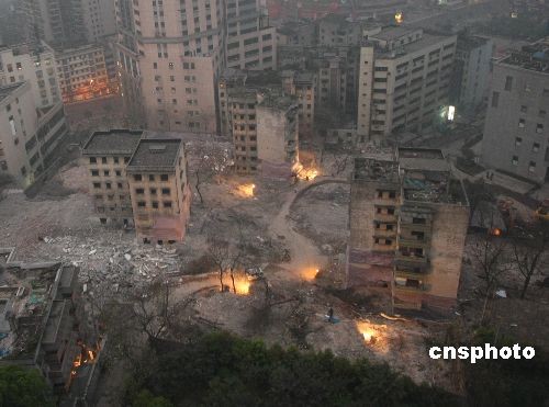 2009年3月21日,重慶江北區(qū)觀音橋處成功進(jìn)行了危舊房定向爆破。當(dāng)日早晨8時(shí),一聲巨響,當(dāng)?shù)赜灞倍宥?hào)地塊的6棟樓房被爆破拆除,總面積1000平方米。這是重慶2009年危舊房改造的第一爆,是觀音橋商圈快速推進(jìn)“長(zhǎng)江上游商貿(mào)中心”的重要舉措。中新社發(fā) 賀終榮 攝