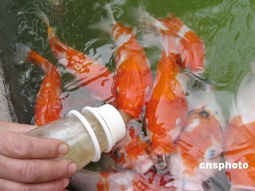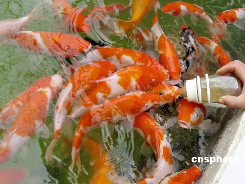 3月25日,在湖北宜昌公園,用奶瓶進食的“吃奶魚”引來許多市民圍觀。該魚是原產日本的錦鯉,壽命在百歲以上,奶瓶裝的是高檔飼料。中新社發(fā) 韓玉洪 攝