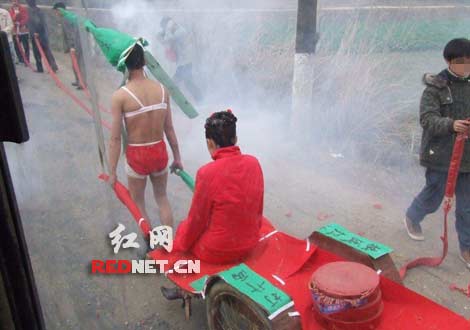 25日上午,網(wǎng)友“鍋爐工”在紅網(wǎng)論壇發(fā)帖,再現(xiàn)了一場(chǎng)“雷人”婚禮,帖子描述道“這男人扮牛頭,拉個(gè)‘投胎轉(zhuǎn)世車’拖著老婆回家,新娘后面放著幾掛鞭炮,據(jù)說(shuō)是驅(qū)鬼用,拉著上‘奈何橋’好恐怖!”