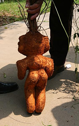 3月25日,江西省上高縣蒙山鄉(xiāng)陂下村一農民在野外取土時,挖出一株根部酷似男性 “人形”神奇植物。該株“人形”植物長約1.25尺(41.6厘米),寬約18厘米,重量約4公斤,人體特征齊全,發(fā)、眼、鼻、耳、嘴、手、腳及男性的生殖器均分明逼真,實屬罕見。據當地老中醫(yī)和藥品檢驗人員初步鑒定,其為野生何首烏,生長年限至少在百年左在。其型狀最為逼真、體株最大的何首烏在當地還未發(fā)現過。