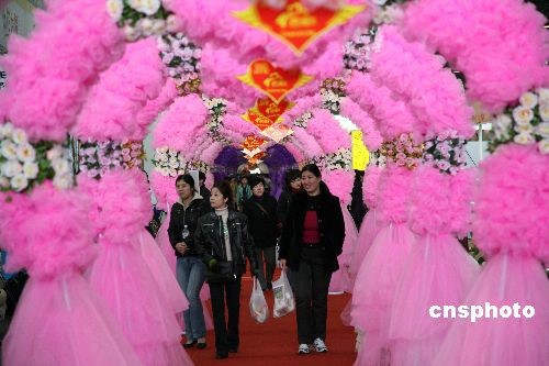 3月29日,在南京國(guó)際展覽中心舉辦的2009南京首屆婚慶文化博覽會(huì)上,組委會(huì)特意制作了一座2009分米長(zhǎng)的婚慶彩門(mén),這座婚慶彩門(mén)由60個(gè)彩色拱門(mén)組成,每15個(gè)彩色拱門(mén)為一種主色調(diào)。據(jù)介紹,這座婚慶彩門(mén)是世界上最長(zhǎng)的婚慶彩門(mén)。中新社發(fā) 鐘山 攝
