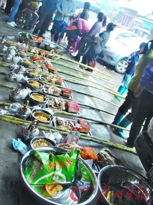 中標(biāo)男青年告訴記者,之所以愿意以高價拍得一套百元左右的祭品,是因為這些祭品含有祖先庇佑的意頭。