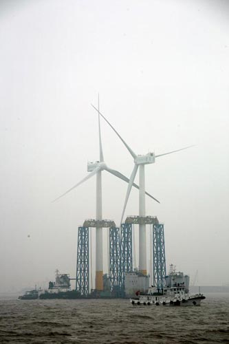 人民網(wǎng)上海4月5日電 昨晚,國家海上風(fēng)電示范項目、上海市重大工程——東海大橋100兆瓦海上風(fēng)電場的第二、第三臺風(fēng)機,在上海洋山港海事處的護航和監(jiān)控下,經(jīng)過38海里的海上航行,被一次性運抵吊裝作業(yè)地點。