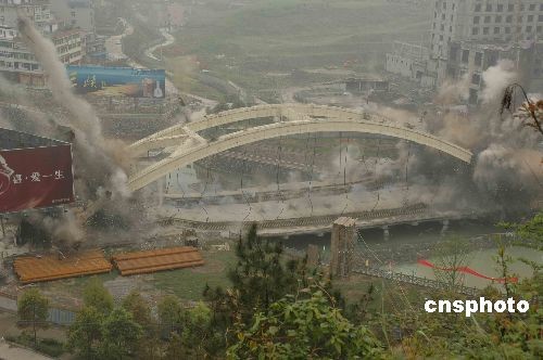 4月5日,在“5.12”汶川大地震中損壞的重慶市黔江區(qū)黔州大橋被成功爆破。黔州大橋于1997年建成,去年“5.12”汶川大地震后,大橋的拱肋、橋面及橋墩等多處出現(xiàn)裂痕,吊桿松動(dòng)嚴(yán)重,當(dāng)?shù)卣扇∠薷叩刃问浇箍拓涊d重車通行,并進(jìn)行監(jiān)測。2009年初,經(jīng)專家勘測、檢驗(yàn),決定拆除該橋。中新社發(fā) 阮守軍 攝