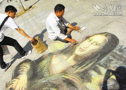 “這蒙娜麗莎畫得太像了!”昨日(15日)下午2時(shí)許,武昌中南路人行道上,一位畫者用粉筆在地上描畫的“蒙娜麗莎”,引來駐足行人的贊嘆。
