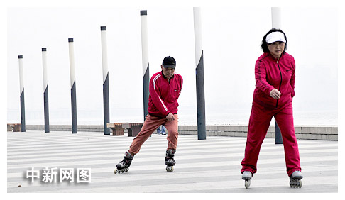 中新網(wǎng)蘇州4月16日電(周昕) 清晨的蘇州工業(yè)園區(qū)金雞湖畔,一群老人特別的顯眼,和一般老人打拳、舞扇、散步的鍛煉方式不同,他們雙手背在身后,腳下踩著“風(fēng)火輪”,八個(gè)人排成一列,向前滑行,一個(gè)滑步便輕松地把其他人遠(yuǎn)遠(yuǎn)地甩在了身后,顯得異常瀟灑并且充滿活力。