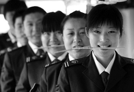 15日,濟(jì)南10路公交車(chē)駕駛員咬著筷子練習(xí)微笑服務(wù)。當(dāng)日,為給乘客提供微笑服務(wù),該車(chē)隊(duì)對(duì)駕駛員進(jìn)行“笑臉迎全運(yùn)”培訓(xùn),按照標(biāo)準(zhǔn)進(jìn)行練習(xí),要求只能露出6到8顆牙齒,為達(dá)要求,司機(jī)在訓(xùn)練微笑時(shí),都會(huì)咬著一根筷子。(本報(bào)記者 王鴻光 通訊員 吳林 攝)