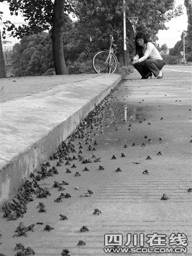 一夜起來(lái),水庫(kù)岸邊,數(shù)以萬(wàn)計(jì)的幼小蟾蜍一蹦一跳地上了岸,一時(shí)間,公路上、道路邊、居民房墻壁上,密密麻麻的蟾蜍讓當(dāng)?shù)鼐用窨吹谩靶念^發(fā)麻”。截至昨日,上述現(xiàn)象已在眉山丹棱縣縣城附近豐樂(lè)水庫(kù)邊出現(xiàn)了好幾天。據(jù)丹棱縣林業(yè)局野生動(dòng)物保護(hù)辦主任方元介紹,此乃蟾蜍遷徙生長(zhǎng)的自然現(xiàn)象。