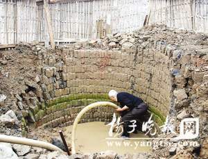 昨天,當(dāng)?shù)卣途脚扇藢ΜF(xiàn)場進(jìn)行封鎖和保護(hù),施工隊(duì)也停止了施工,為防不法商人進(jìn)入古井內(nèi)掏寶,當(dāng)?shù)卣在古井旁架起隔離欄,并派民警和保安24小時值守。為確認(rèn)古井的真實(shí)身份,當(dāng)?shù)卣垇砹四暇┦胁┪镳^考古人員,對古井進(jìn)行驗(yàn)明正身?脊湃藛T找來抽水機(jī),對古井里積水進(jìn)行外排,井口直徑有2米多,井口邊到外是破損的殘磚碎片,工作人員用竹竿測量了一下,發(fā)現(xiàn)古井內(nèi)的積水有2米深,殘留的井壁上磚塊排列整齊。記者發(fā)現(xiàn),古井周圍全是巖石,這么個古井能打在巖石上真是不易。據(jù)現(xiàn)場一名保安告訴記者,遺憾的是由于施工時不在意,井口上半部已經(jīng)被挖掘機(jī)挖掉了至少六米以上,目前僅剩下古井的下半身4米高的距離。
