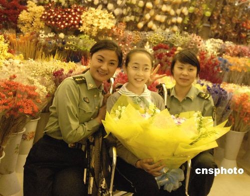 去年汶川大地震中,北川曲山小學(xué)一個(gè)喜歡跳芭蕾舞的十二歲女孩李月在地震中失去左腿,后來(lái)在解放軍昆明總醫(yī)院接受治療。4月26日,這名被稱為“芭蕾女孩”的李月來(lái)到昆明答謝對(duì)她悉心照顧的醫(yī)生們。圖為4月27日,她在解放軍昆明總醫(yī)院醫(yī)生陪伴下到昆明岔街花市選購(gòu)鮮花時(shí),與同行的兩名醫(yī)生在花市留影。中新社發(fā) 保旭 攝