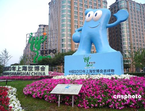 2009年4月28日,上海世博會(huì)吉祥物“海寶”花壇整體亮相北京東單路口處,迎接世博會(huì)倒計(jì)時(shí)一周年的到來(lái),可愛(ài)的“海寶”吸引了過(guò)往行人的目光。2010年上海世博會(huì)吉祥物“海寶(HAIBAO)”,意為“四海之寶”,以藍(lán)色漢字的“人”作為核心創(chuàng)意,既反映了中國(guó)文化的特色,又呼應(yīng)了上海世博會(huì)會(huì)徽的設(shè)計(jì)理念。中新社發(fā) 玉龍 攝