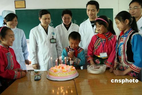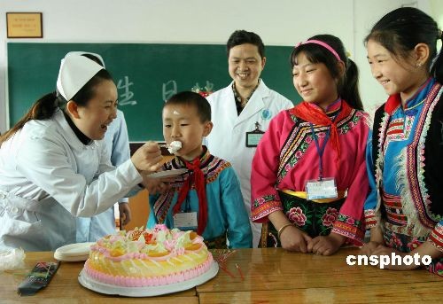 4月29日,四川災(zāi)區(qū)汶川綿虒小學(xué)在廣安異地復(fù)課學(xué)生張翔迎來(lái)11歲生日,曾在2008年“5.12”汶川地震發(fā)生后當(dāng)日奔赴汶川綿虒鎮(zhèn)救死扶傷的廣安區(qū)人民醫(yī)院醫(yī)生護(hù)士專程來(lái)到學(xué)校,為張翔舉辦生日派對(duì),并送上生日大蛋糕。中新社發(fā) 廖小兵 攝