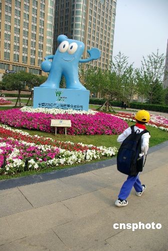 4月29日,中國(guó)2010年上海世博會(huì)吉祥物“海寶”和會(huì)徽花壇亮相北京長(zhǎng)安街。2010年上海世博會(huì)吉祥物“海寶(HAIBAO)”,意為“四海之寶”,以藍(lán)色漢字的“人”作為核心創(chuàng)意。會(huì)徽?qǐng)D案以中國(guó)漢字“世”字書法創(chuàng)意為形,表達(dá)世博會(huì)“理解、溝通、歡聚、合作”的理念。中新社發(fā) 九州 攝