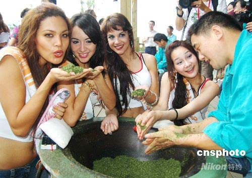 2008年6月23日,剛剛拉開帷幕的2008蘇州相城中國珍珠節(jié)暨世界休閑小姐總決賽迎來了巡游活動,來自世界75個國家和地區(qū)的眾多選手們來到蘇州家具城、荷塘月色景區(qū)和珍珠城,學習茶道,采集河蚌、剖蚌取珠、觀賞荷花、選購珍珠飾品等,佳麗們所到處都吸引了眾多市民圍觀和合影。蘇州相城區(qū)推出的“江南風情游”,讓佳麗們感受到了無窮樂趣。中新社發(fā) 朱子寒 攝