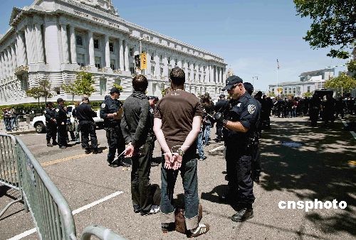 當(dāng)?shù)貢r(shí)間5月26日,美國(guó)加州最高法院宣布,維持去年十一月四日加州選民通過的禁止同性戀者結(jié)婚的八號(hào)提案。法院同時(shí)裁決,十一月四日前領(lǐng)取結(jié)婚證書的一萬八千余對(duì)同性戀者婚姻合法。最高法院的裁決引起同性戀支持者的強(qiáng)烈不滿,他們?cè)谑懈髲B前的十字路口靜坐示威,阻擋交通長(zhǎng)達(dá)數(shù)小時(shí),警方最后逮捕了一百五十余人。中新社發(fā) 陳鋼 攝