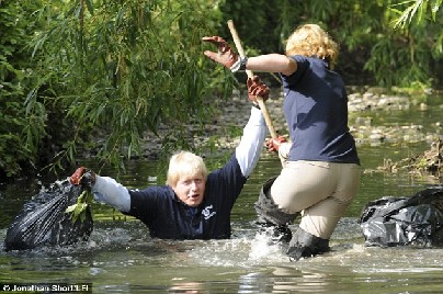約翰遜當時正在和志愿者們一同為倫敦東南部的普利河清除垃圾,穿著防水長靴、戴著橡膠手套的他在靠近岸邊的淺水區(qū)忙得不亦樂乎。在攝像機面前擺出各種姿勢后,約翰遜突然被一個水洼絆倒,并跌倒在河水中。3名志愿者見勢沖了過去,用一根竹竿奮力將他拖出水面。