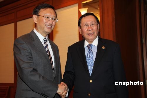 中國(guó)外交部部長(zhǎng)楊潔篪(左)二十一日在泰國(guó)普吉會(huì)見(jiàn)了出席東盟地區(qū)論壇外長(zhǎng)會(huì)的菲律賓外長(zhǎng)羅慕洛(右)。雙方還就共同關(guān)心的國(guó)際和地區(qū)問(wèn)題交換了看法。楊潔篪于當(dāng)日抵達(dá)泰國(guó)普吉,出席中國(guó)-東盟外長(zhǎng)會(huì)、東盟與中日韓外會(huì)、第十六屆東盟地區(qū)論壇外長(zhǎng)會(huì)和東亞峰會(huì)外長(zhǎng)非正式磋商。中新社發(fā) 顧時(shí)宏 攝