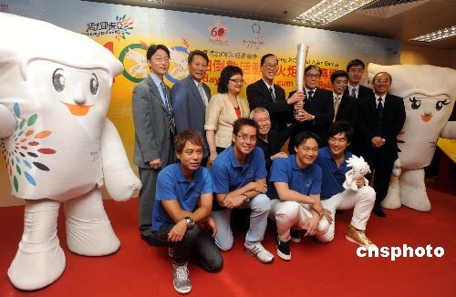 七月二十三日,香港二零零九年?yáng)|亞運(yùn)動(dòng)會(huì)為一百日倒數(shù)活動(dòng)及火炬接力傳遞活動(dòng)舉行記者會(huì),公布相關(guān)事宜。香港民政事務(wù)局局長(zhǎng)曾德成、東亞運(yùn)動(dòng)會(huì)籌備委員會(huì)主席霍震霆于會(huì)上手持運(yùn)動(dòng)會(huì)傳遞的火炬,并與出席嘉賓及運(yùn)動(dòng)會(huì)吉祥物合照。中新社發(fā) 鄧慶樂 攝