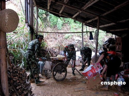 6月25日,福建霞浦鹽田邊防派出所官兵在轄區(qū)釣岐村村民謝玉海家進(jìn)行救助。受臺(tái)風(fēng)“蓮花”影響,福建寧德陰雨不斷,霞浦鹽田部分地帶出現(xiàn)山體滑坡、泥石流現(xiàn)象,靠山居住的村民出現(xiàn)危機(jī)。獲悉情況后,當(dāng)?shù)剡叿拦俦鴮?duì)居住危險(xiǎn)地帶的50余戶群眾進(jìn)行了迅速轉(zhuǎn)移,并幫助受災(zāi)戶進(jìn)行積極救助。中新社發(fā) 王力鵬 攝