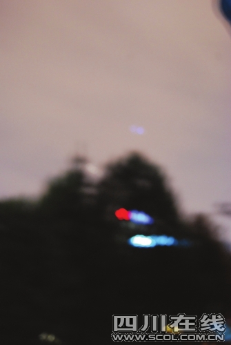 昨(7月2日)晚8點30分左右,成都磨子巷上空出現(xiàn)不明飛行物,附近上千市民從家中跑出,到陽臺或街上觀望:夜幕中有一藍色光團如圓月大小,靜靜觀看時,可發(fā)現(xiàn)該光團藍紅光交替,向西南方向緩慢移動(如圖)。該現(xiàn)象持續(xù)至9點50左右結(jié)束,成都市飛碟協(xié)會秘書長楊佛章初步猜測,是涂有發(fā)光材料的風(fēng)箏等物品造成的。