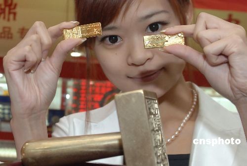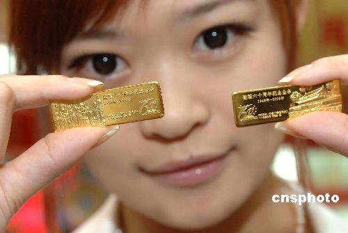7月13日,國博版“建國60周年紀(jì)念金條”在北京宣布上市。圖為工作人員展示該套金條。產(chǎn)品每套含兩根25克Au9999金條,第一根金條主圖案選用了著名女?dāng)z影家候波1949年拍攝、現(xiàn)存唯一的《開國大典》正面原景歷史照片,記錄了毛澤東向世界宣告新中國成立的經(jīng)典瞬間。第二根金條主圖案選用了北京市民曹連弟2009年拍攝的《天安門》照片,從普通市民視角反映了舉國同慶的歷史場景。中新社發(fā) 鄒憲 攝